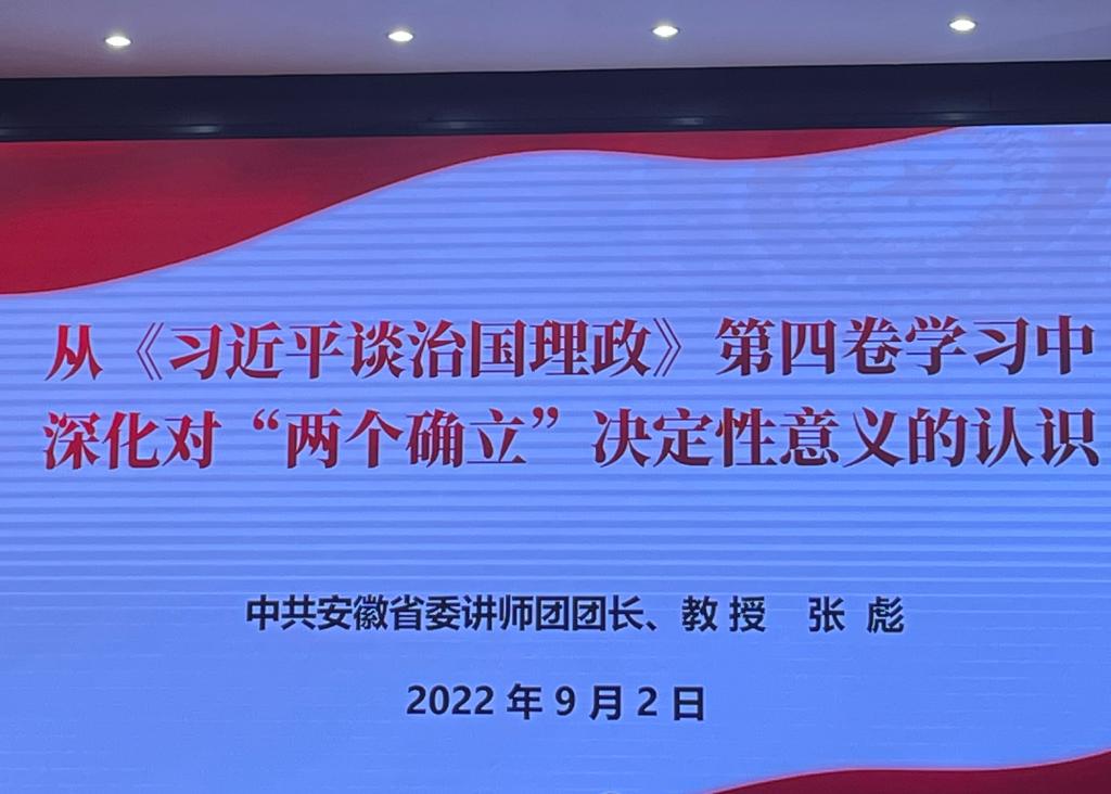 为贯彻落实习近平总书记在省部级主要领导干部专题研讨班上重要讲话精神,全省开展“举旗帜·送理论”省级示范宣讲活动。淮北市委宣传部邀请了中共安徽省委讲师团团长张彪教授于9月2日上午9时在市公安局报告厅作宣讲报告,张团长宣讲的主题为:从《习近平谈治国理政》第四卷学习中深化对“两个确立”决定性意义的认识。beat365中国官网刘奔前和孙澄澄老师作为入选的淮北市宣讲团成员,代表学校参加会议。