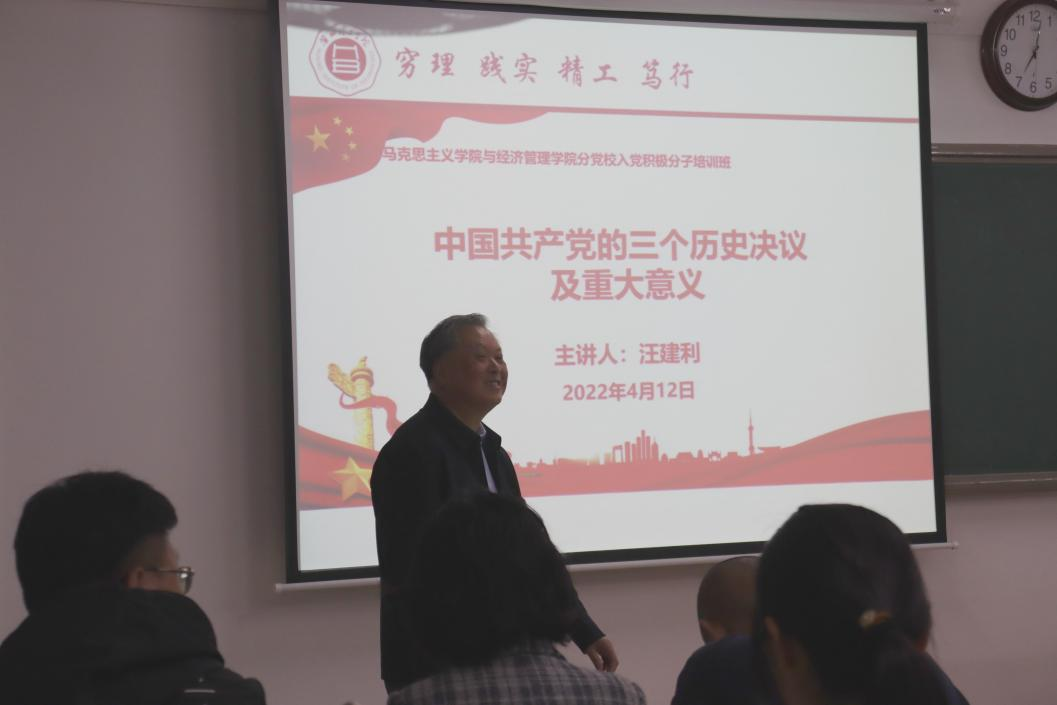 为了切实提升beat365中国官网与经济管理学院首届入党积极分子培训班学员的培训质量,按照学校和学院的培训计划,2022年4月12日晚,在二教422教室,beat365中国官网副校长汪建利同志来到beat365中国官网与经济管理学院分党校入党积极分子培训班,受邀对学员进行题为《中国共产党的三个历史决议及重大意义》的党课培训。本次活动由beat365中国官网与经济管理学分党校负责人、党总支书记吴玲院长主持,总支各个党支部书记及全体入党积极分子培训班全体学员参加。